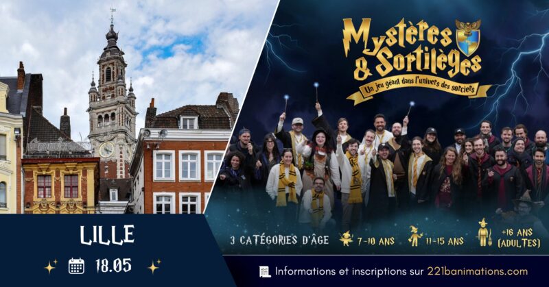Un événement inspiré de l’univers Harry Potter dans la ville de Lille le 18 mai prochain au parc Jean Baptiste Lebas. Mystères & Sortilèges, c’est un jeu géant se déroulant dans l’univers des sorciers. Les participants rejoignent une maison (une équipe) et participent pendant 2h à de nombreux défis en extérieur (jeux d’adresse, logique, énigmes, enquête, etc …) pour accumuler un maximum de points et tenter de remporter la coupe ! Le jeu est encadré par des animateurs professionnels en costume et dispose de décors originaux, réalisés spécialement pour l’occasion. Mystères & Sortilèges se veut accessible afin de permettre à tout le monde de s’amuser que ce soit en famille ou entre amis.