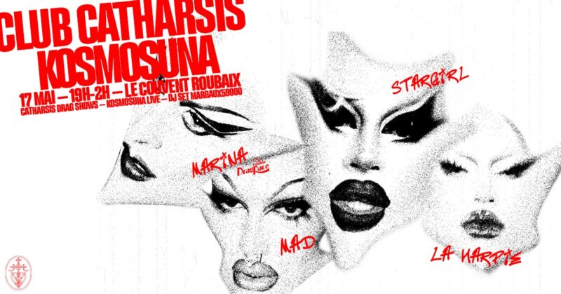 Stargirl & Mad, iconiques drag queens lilloises et tenancières du CLUB CATHARSIS fusionnent avec le groupe d’electronica – fantasy pop KosmoSuna et débarquent au Couvent à Roubaix pour une édition XXL mêlant drag shows, performances, live et DJ set ! Pour cette édition spéciale de CLUB CATHARSIS, Mad, Stargirl & KosmoSuna ont vu les choses en très grand ! Le Couvent devient le club, le club devient Le Couvent.. pour vous proposer un spectacle et une grande fête ultra méga cathartique. L’occasion de découvrir l’univers de Marina, reine de la deuxième saison de Drag Race España. Profiter de performances d’exceptions de vos queens locales préférées : Stargirl, Mad & La Harpie, du live de KosmoSuna et du paysage visuel créé par Eqko. Et aussi clubber, danser sur le DJ set de la légende Margaux 59000 jusqu’à 2h !