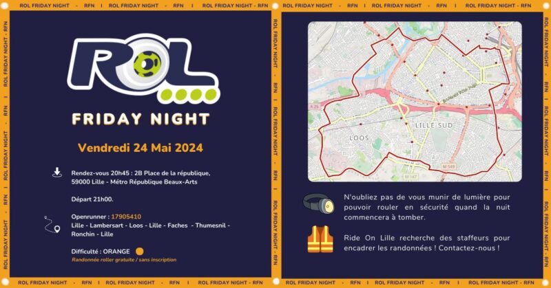 Ride On Lille vous propose un rendez-vous ROLLER pour rouler dans la métropole Lilloise. Une rando ROLLER gratuite et sans inscription. Pour participer en roller, un niveau minimum est requis (savoir se déplacer avec aisance en roller, savoir freiner). Les autres moyens de mobilités douces sont acceptés en fin de cortège ! (vélo, skateboard, trottinette…). Les protections sont vivement recommandées. Pensez à prendre des LUMIERES pour ÊTRE VISIBLE et voir dans l’obscurité. Départ 21h.
