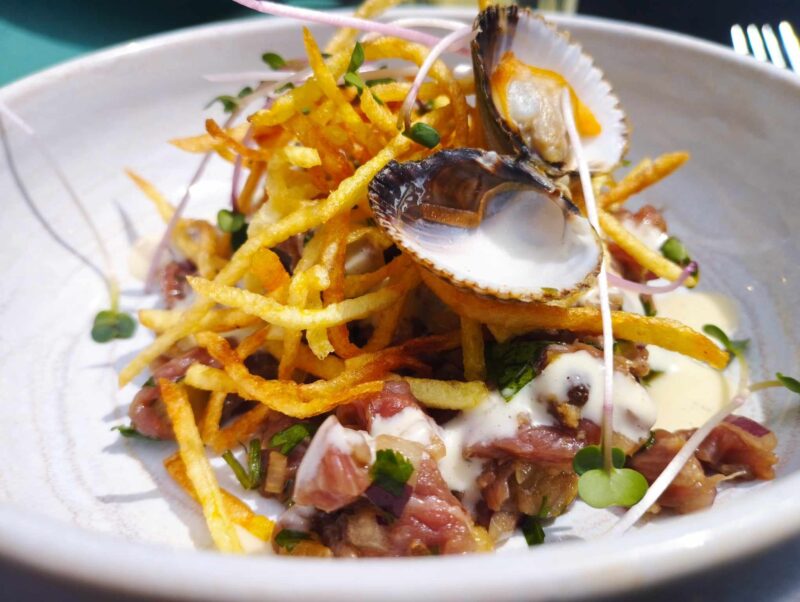 C’est avec l’estomac gargouillant d’un lendemain de soirée, comme dans un Bateau Ivre, que nous avons testé le resto. Même le soleil était au rendez-vous. Du coup, on s’est posé en terrasse pour une double dose de plaisir. Le chef vient à table prendre les commandes et surtout décrire avec amour ses plats. De la poésie. On en a plein la bouche avant même d’avoir commencé. Même le nom des plats est une invitation à passer du bon temps. On sélectionne unanimement un tartare de boeuf aux coquillages. Un bonheur. Original, assaisonné avec un jeu de texture. Chapeau bas.
