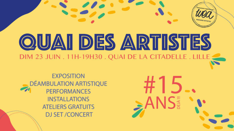 Le Quai des Artistes 2024 se déroulera le dimanche 23 juin de 11h à 19h30 quai Jouhaux. Pour cet anniversaire, le Collectif Weekend’Artistes transformera le quai de la basse Deûle en espace d’art contemporain et urbain Au programme, 40 artistes des arts visuels seront présents et proposeront une exposition, des installations, des performances se feront également tout au long de la journée. Faire d’une espace naturel, un espace d’art contemporain et urbain où se fait la rencontre artistique. Performance Streetart, Dj set, Déambulation artistique, Atelier maquillage tattoo enfant, Ateliers gratuits. Quai des Artistes c’est aussi des ateliers artistiques pour tous, pochoirs, sérigraphie, monotype…
