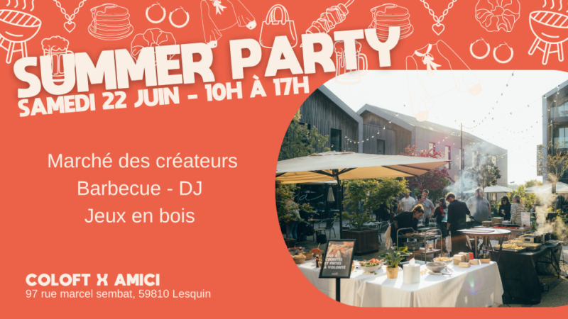 On a trouvé l’événement parfait pour se remettre de la fête de la musique ! Une SUMMER PARTY de 10h à 17h dans le magnifique complexe du Coloft à Lesquin. Au programme, un marché des créateurs, un BARBECUE fait par le restaurant Amici avec DJ, des jeux en bois pour petits et grands… L’événement est en accès libre et ouvert à tous, mais il est conseillé de réserver une table pour déjeuner le midi et profiter de ce barbecue de folie. La formule barbecue proposée s’élève à 26,5€ par personne, et inclus une grillade + accompagnements à volonté + une boisson.