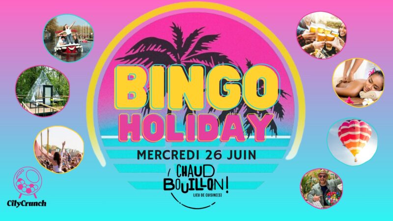 Pour ce Bingo Holiday, Lille CityCrunch vous invite en vacances à Chaud Bouillon. Au programme : des supers cadeaux ensoleillés, une halle gourmande de 350 places avec de la food estivale, des boissons bien fraiches et beaucoup de fun . Bien sûr des CADEAUX XXL À GAGNER ! Quelques exemples pour vous mettre l’eau à la bouche : Nuit insolite BY L’Étang d’une Pause, Vol en montgolfière BY Les Ballons Migrateurs, 4 Pass au Bivouac Festival BY AGDL. Nuit en cabane & bain nordique BY Ferme 1851. Repas pour 4 + Boissons BY Chaud Bouillon. Spa privatif pour 2 BY Kechmara, Balade en Bateau + Apéro pour 11 BY Marin d’Eau Douce. Repas au corner Chaud Bouillon BY Bierbuik. 4 Pass au Festival Cote d’Opale BY AGDL ou un Repas gastronomique pour 2 BY La Salle à Manger … Réservez vite votre place, il en reste encore quelques unes !