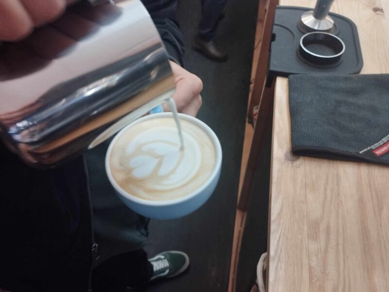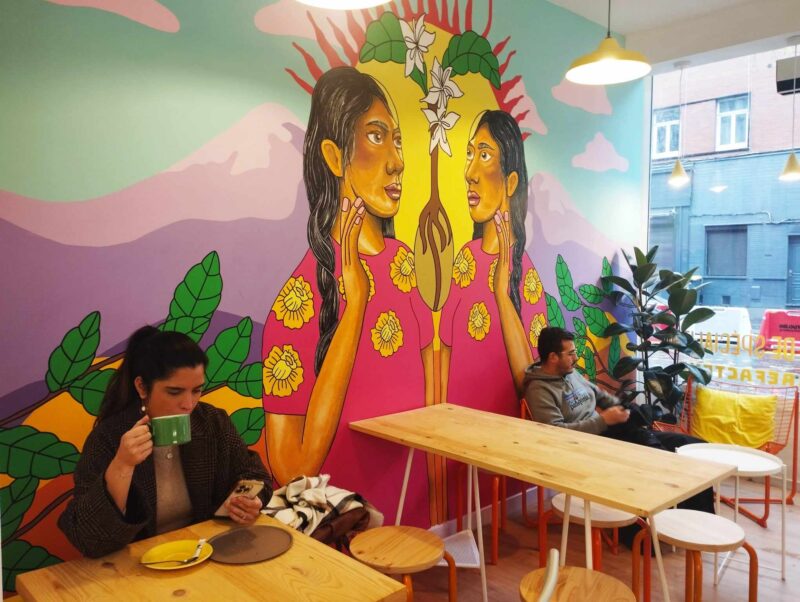 Bon, le lieu est cool. Une fresque lumineuse plante le décor. Des petites tables en bois. Belle atmosphère pour boire un cappuccino ou un Latte, fait exclusivement avec le café torréfié sur place. Le lieu ouvre de 12h à 21h donc il n’y a pas que de quoi garnir la pause café. Le midi, on vient grignoter du salé dans l’esprit mexicain. Guacamole, nachos, tartine à l’avocat ou encore croissant sandwich avec chips et concombre dedans.