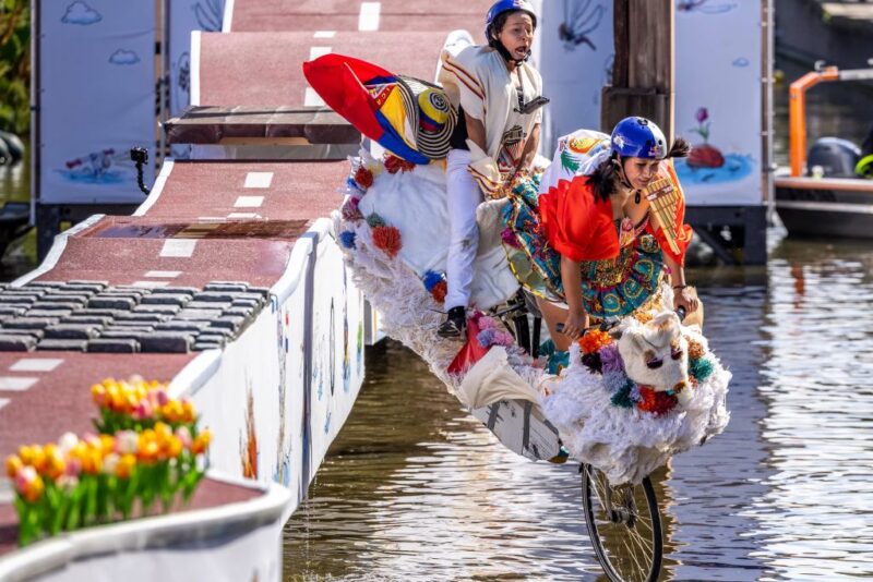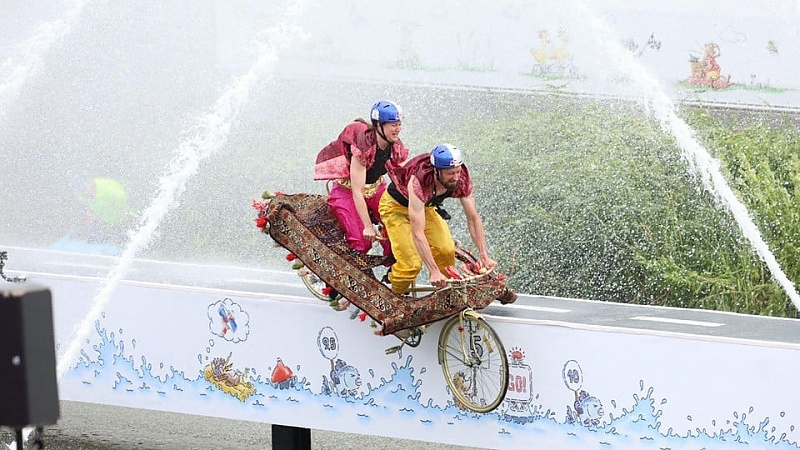Sur un parcours sinueux et gondolé au dessus de l’eau, vous partez en équipe de 2 à bord d’un vélo tandem en acier, customisé par vos soins, laissant place à la magie de votre imagination comme à vos talents de bricoleurs. L’objectif est de parvenir jusqu’à la cloche en fin de parcours sans tomber à l’eau. Attention, il s’agit d’aller le plus vite possible, d’être le plus original tant sur les tenues que sur l’aspect de votre bolide. Le tout dans la joie et la bonne humeur, devant un public venu nombreux pour se délecter de ce spectacle insolite !